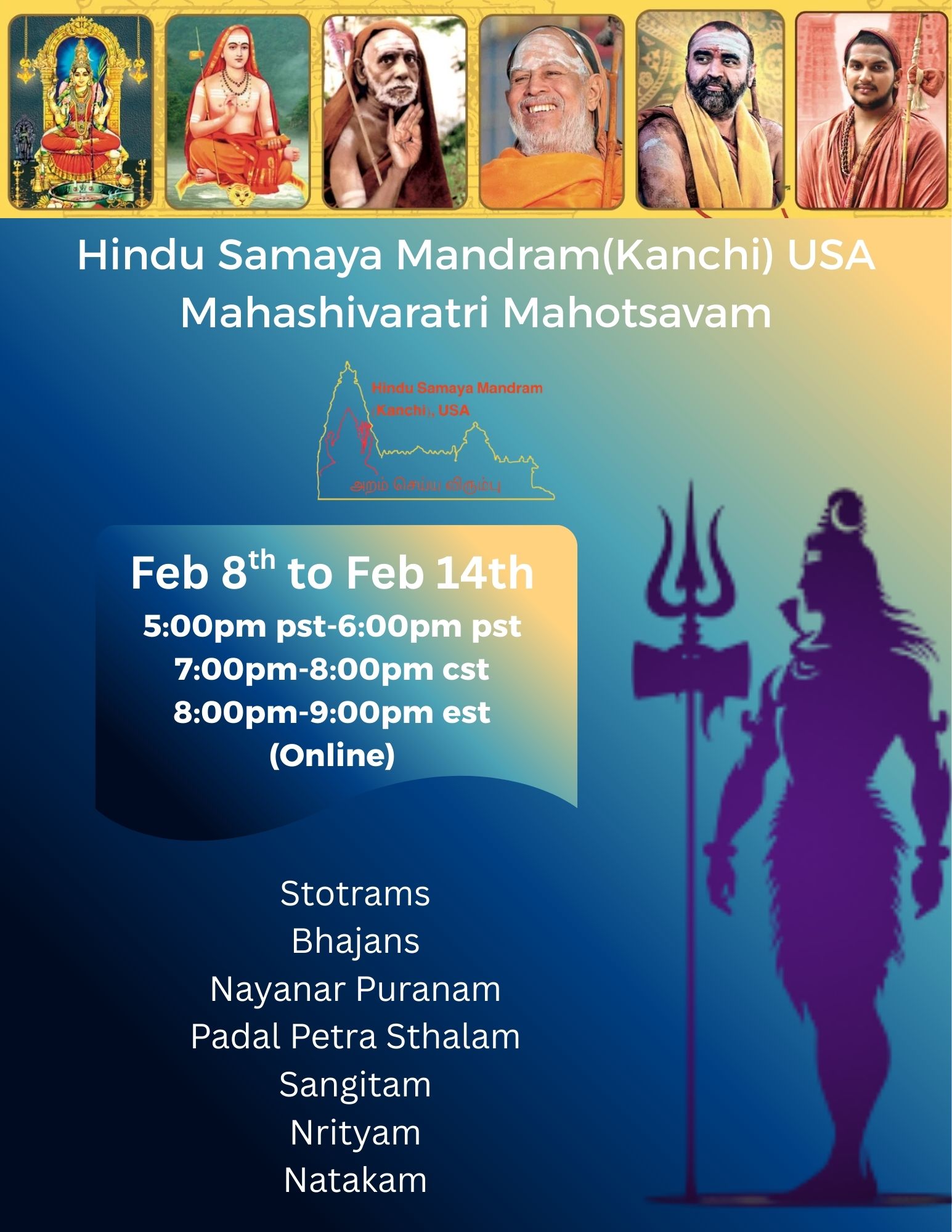 All children and youth are invited to participate in HSM USA’s Mahasivaratri Mahotsavam. This is an annual online event which will be hosted daily from Sunday Feb 8th to Saturday Feb 14th from 5:00pm pst/7:0pm cst/8:00pm est for one hour.